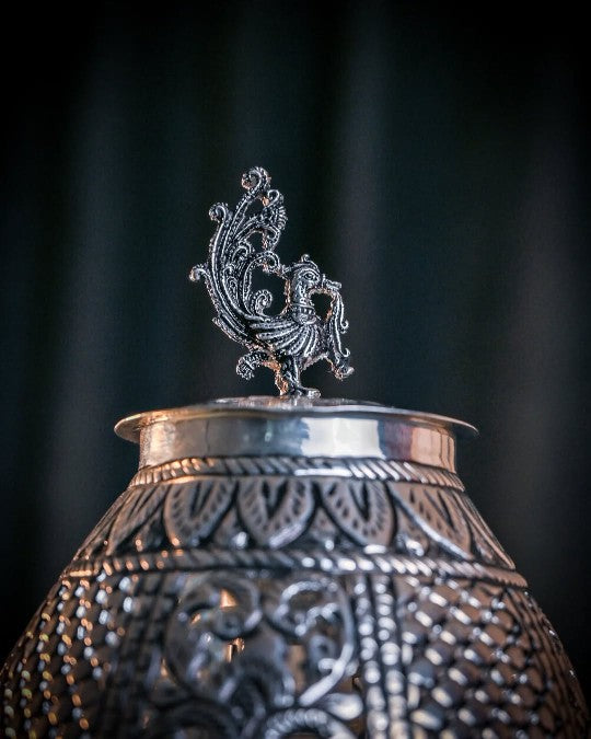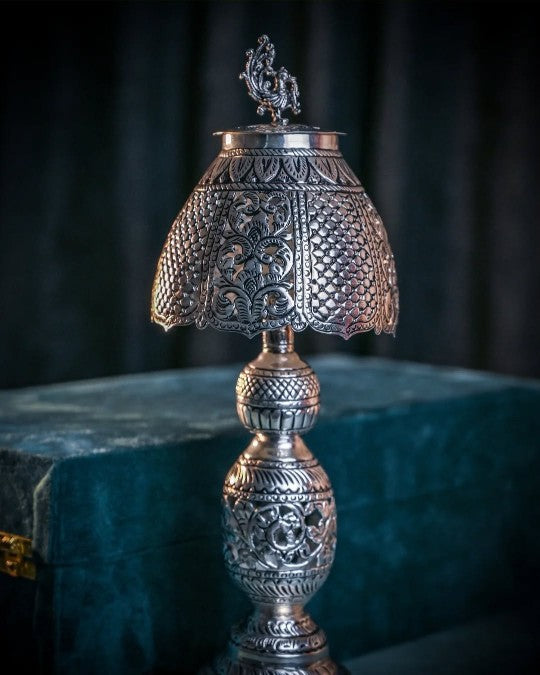 NANDIGHOSH SILVER ART presents a beautifully handcrafted silver lamp showcasing intricate traditional desigs and fine detailing made with premium quality silver this elegant piece adds a touch of royalty and devotion to any decor or pooja space.