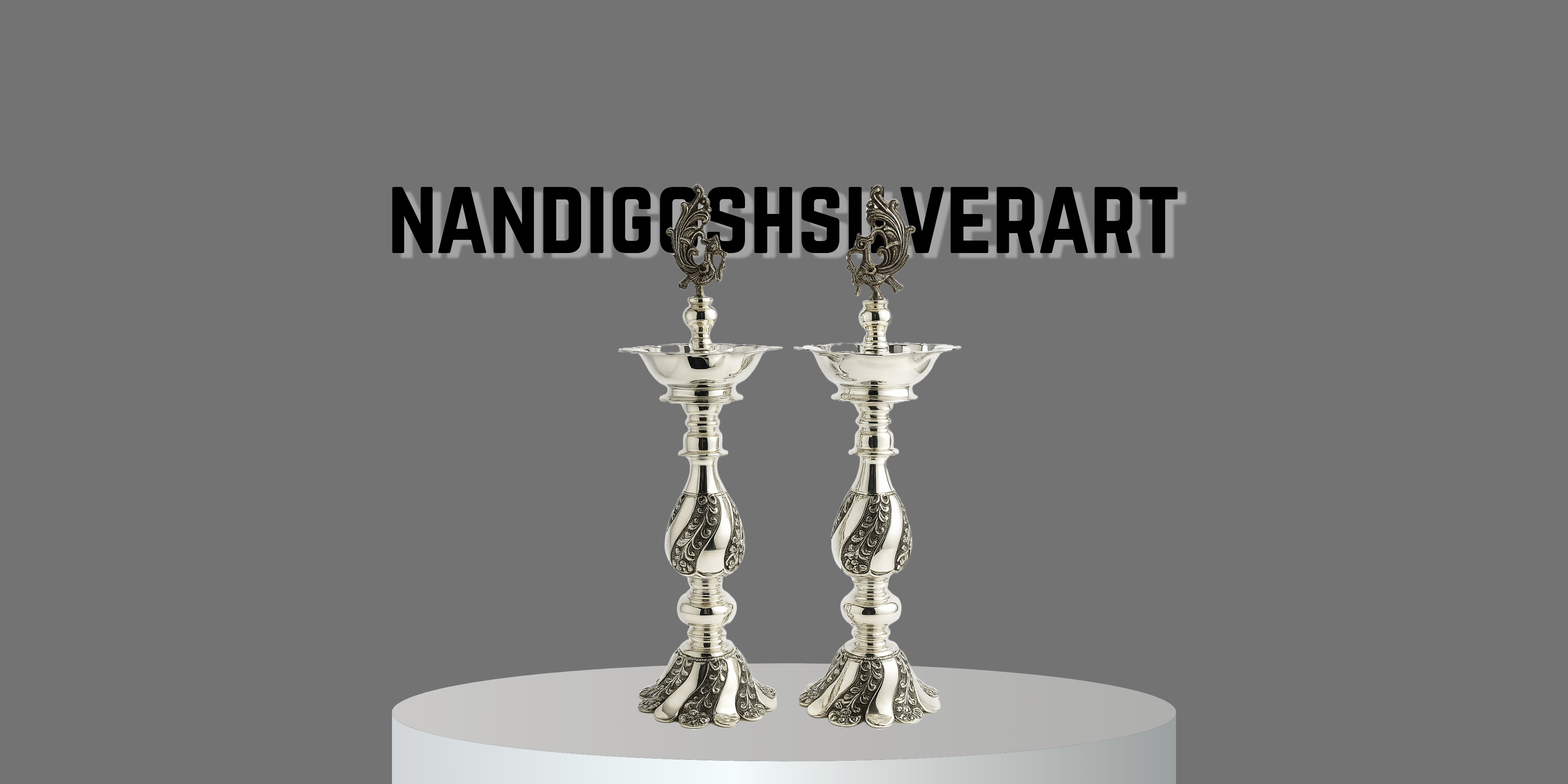 Nandigosh Silver Art Traditional Deepak Stand – Pure Silver Finish, Handcrafted Pair