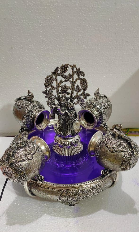 Experience the divine charm of traditional artistry with the Nandighosh Silver Art Brass Fountain, a magnificent creation that combines spiritual elegance with exquisite craftsmanship. This handcrafted brass fountain features a beautifully sculpted figure of Lord Krishna under a Kalpavriksha (divine tree), surrounded by intricately designed four ornamental pots (matkas) symbolizing prosperity and purity.