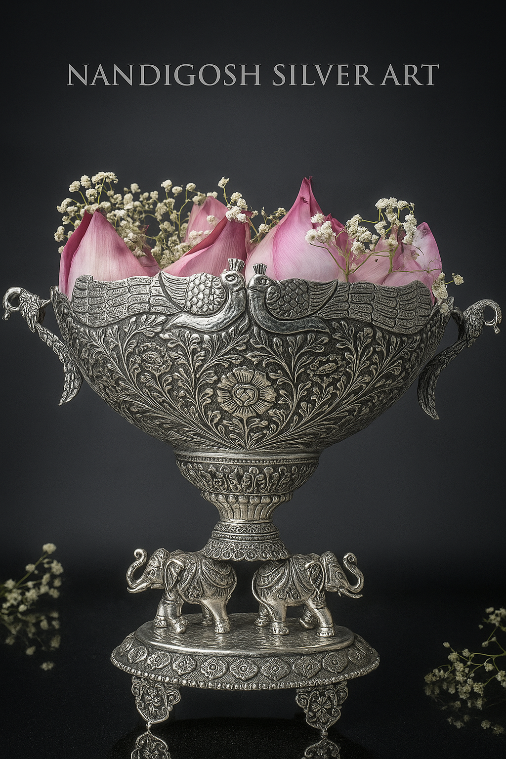 Experience timeless craftsmanship with this exquisite handcrafted silver fruit bowl from Nandigosh Silver Art. Adorned with intricate peacock and floral engravings, this masterpiece rests gracefully on elephant-shaped supports, symbolizing strength and prosperity. Perfect for showcasing fruits, flowers, or as a luxurious décor piece, it adds a royal touch to any home or festive setting. Crafted in premium silver with fine detailing, it’s a blend of tradition, artistry, and elegance.