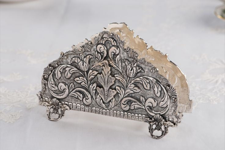 Add a touch of royal elegance to your dining or living space with this handcrafted silver tissue paper holder from Nandighosh Silver Art. Made with premium quality silver and adorned with intricate floral engravings, this piece beautifully blends functionality with artistry. Its detailed filigree design and antique finish make it a perfect décor accent for both modern and traditional settings. Ideal for gifting or personal use, this elegant holder reflects timeless craftsmanship and luxury.